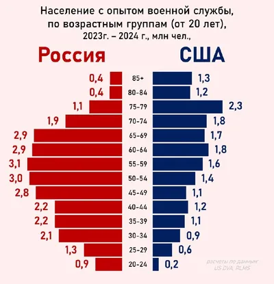Население России и США с опытом военной службы, по возрастным группам (от 20 лет), млн чел. Всего в возрасте 20-54 лет (верхняя возрастная граница мобилизации рядовых в РФ) в США 6,5 млн чел., в Росс
