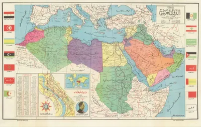 Интересная карта арабского мира от лиги арабских государств 1960 года с невидимым Израилем и двойным Йеменом. У половины стран государственные флаги не похожи на современные. Сможете определить где