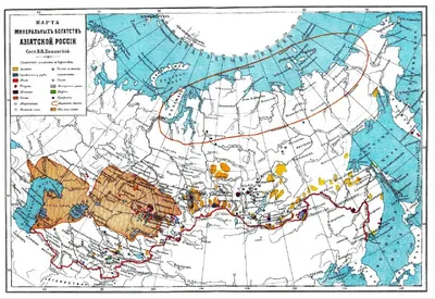 Карта полезных ископаемых азиатской части РИ 1900г. В Сибири столетней давности разведана только более-менее обитаемая её южная часть вблизи строящегося транссиба, а на севере - сплошное белое пятно,