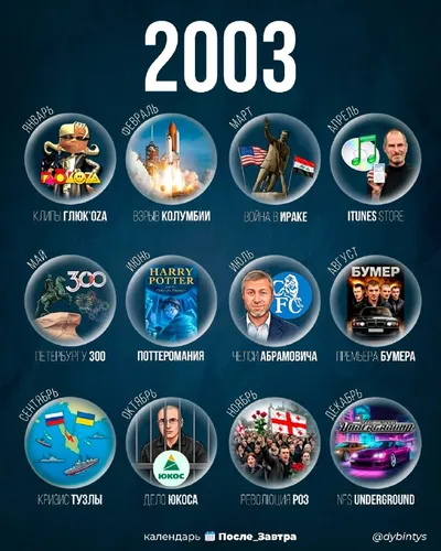 🗓️ Чем запомнился 2003-й ❓ Январь 📺 Клипы Глюк’oza 🎨 Февраль 💥 Катастрофа Колумбии 🚀 Март 🇮🇶 Война в Ираке 🇺🇸 Апрель 🍎 iTunes Store 🎵 Май 🌧️ Петербургу 300 лет 🎆 Июнь 📚 Разгар Поттеро