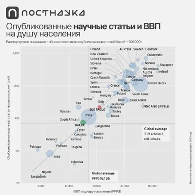 «Существует почти линейная зависимость между ВВП на душу населения и числом научных публикаций на душу населения. Чем выше уровень экономики, тем больше научная активность. Это видно во всём диапазоне