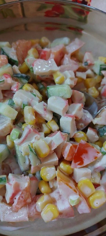 САЛАТ "КРАСАВИЦА" Фото-рецепт от Oxana_OxiS_Sypko Ингредиенты: - 100грамм крабовых палочек; - 1 огурец; - 2 помидора; - зеленый лук; - 0,5 банки кукурузы; - постный майонез (вне поста можно сметану);