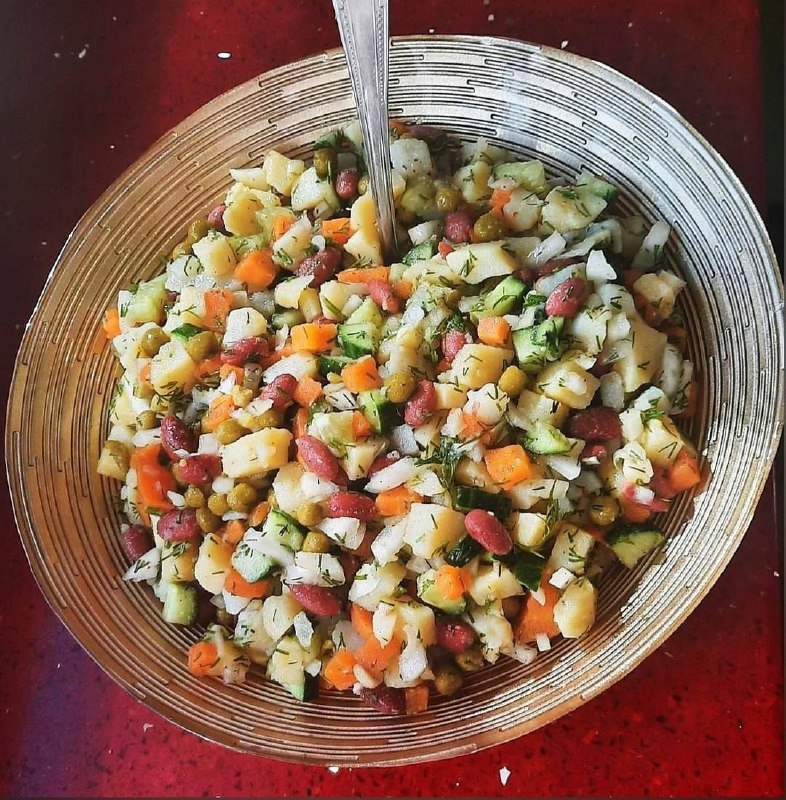 ПОСТНЫЙ "ОЛИВЬЕ" С ФАСОЛЬЮ Ингредиенты: - 4 картошки; - 2 моркови; - 1 луковица; -1/2 стакана фасоли консервированной или отварной; - 1/2 стакана зеленого горошка; - 1 огурец; - пучок укропа; - 4-5 с
