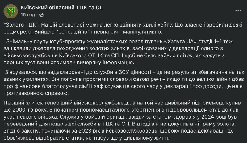 Сотрудник ТЦК в Буче, пригороде Киева, задекларировал золотые слитки на сумму 7,7 млн гривен, при том что его официальный годовой доход составил около 400 тыс. грн. Согласно декларациям, объём задекл