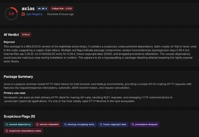 Massive axios supply chain campaign 👩💻 В популярной библиотеке axios (версии 1.14.1 и 0.30.4) был обнаружен опасный троян (RAT), внедренный через взломанный аккаунт одного из мейнтейнеров проекта.