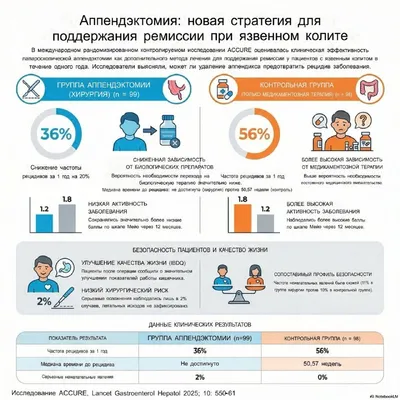 Казалось бы - где аппендикс, а где язвенный колит? Но все немного сложнее По данным довольно крупного исследования каждый 2️⃣-й пациент с клинической ремиссией язвенного колита имеет воспаление аппен