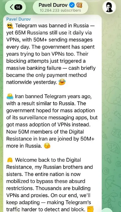⚡️ Павел Дуров сообщил, что, несмотря на блокировки, Телеграмом продолжаются пользоваться 65 миллионов россиян ежедневно Так создатель мессенджер прокомментировал блокировки. ⏪Telegram был заблокиро