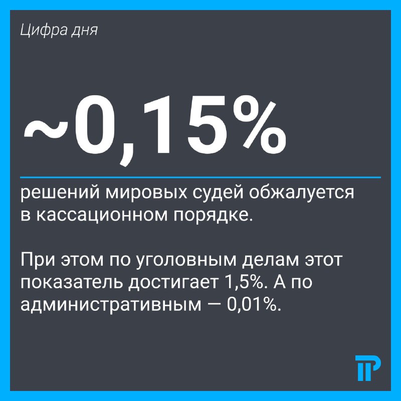⚖️ Зампред Верховного суда Владимир Давыдов раскрыл статистику кассационного обжалования решений мировых судей. Из 27,5 млн решений, которые мировые суды выносят ежегодно, в кассации оспаривают только