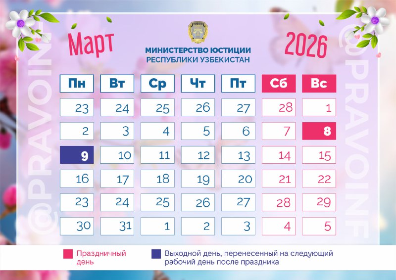 #Сообщение_юстиции ❗️ Сколько дней мы отдыхаем в связи с праздниками Рамазан хайит и Навруз? 🔰 В связи с праздниками выходными днями объявлены: 🔹 20 марта (пятница) – день праздника Рамазан хайи