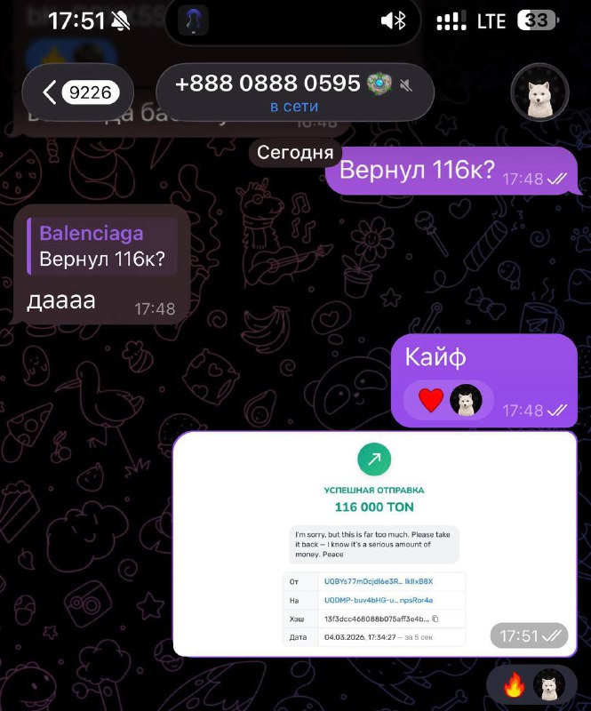 Волка который собирал сейлер муны🎁 заскамили на 126к TON Простой схемой, после обычного перевода денег ему пришла копеечная сумма от кошелька скамера, с идентичным началом и концом кошелька, который