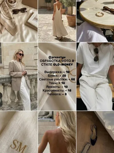✨ Обработка фото в стиле Old Money Сохраните настройки, если хотите получить спокойные, дорогие и эстетичные фотографии в стиле old money. Такой фильтр делает цвета более мягкими, приглушает яркость