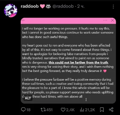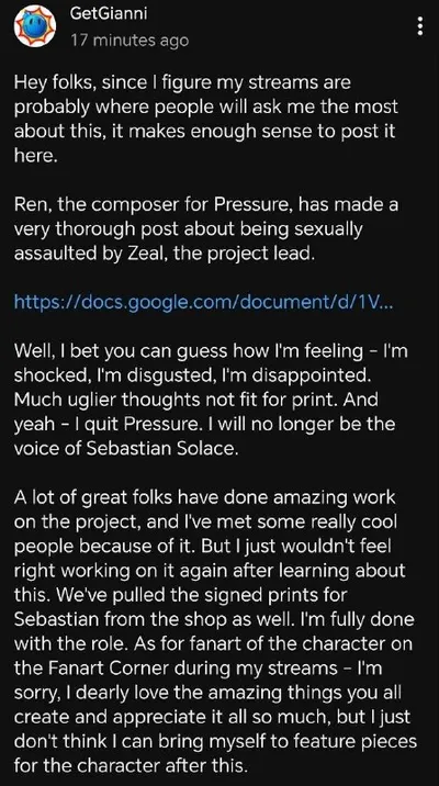 Я больше не буду работать над Pressure. Мне больно это говорить, но я не могу, находясь в здравом уме, продолжать работать под руководством человека, который совершал такие ужасные поступки. Я искрен