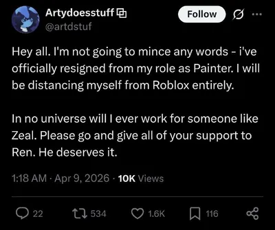 Всем привет. Не буду ходить вокруг да около — я официально ушёл с должности художника (Painter). Я полностью прекращаю своё участие в Roblox. Ни при каких обстоятельствах я не стану работать на таког