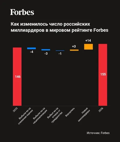 Новый рекорд: число олигархов в России достигло 155 человек Forbes публикует 40-й ежегодный рейтинг богатейших людей мира. В 2026 году число российских миллиардеров в мировом списке выросло до нового