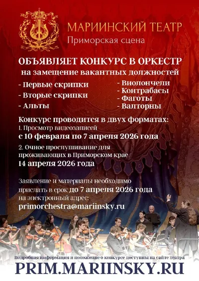 🎶 Прослушивание в оркестр #ПримМариинский Приморская сцена Мариинского театра приглашает талантливых музыкантов на вакантные позиции: 🎼Первые и вторые скрипки 🎼Альты, виолончели, контрабасы 🎼Фаг