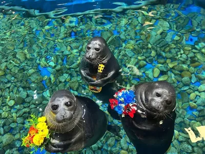 🎉🦭Бусинка и Тучка отмечают 10-летие! Праздничные гирлянды, цветы и вкусный рыбный торт! 19 марта эти невероятно милые создания появились в океанариуме! Альф постарше, ему сегодня исполнилось 14 л
