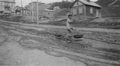 Китаец-разносчик во дворе 1919 Автор: М.Хаскелл Источник: Д.А.Анча, В.И. Калинин, Т. З. Поздняк "Владивосток в фотографиях Мэрилла Хаскелла 1919-1920 годов". Изд-во "РИОТИП". 2009 Торговля велась не