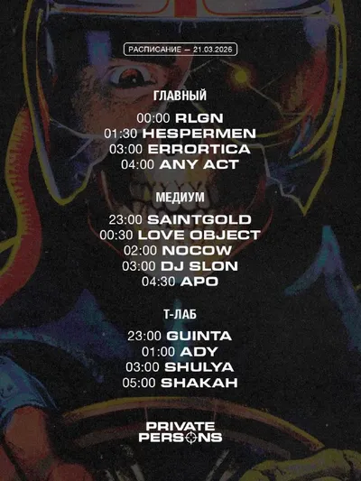 PRIVATE PERSONS — 21.03.2026 ПОЛНЫЙ СОСТАВ АРТИСТОВ CАНКТ-ПЕТЕРБУРГ, К-30 Редкий визит Private Persons в Петербург. В лайнапе — резиденты и друзья лейбла. Артисты, формирующие его звук. Встречаемся