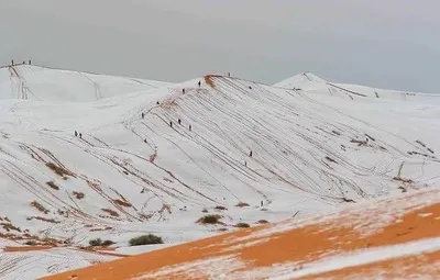 В пустыне Сахара выпал снег Позавчера на севере Алжира оранжевые песчаные дюны превратились в белые холмы. Такое зрелище можно застать не часто – раз в 5-10 лет. Ученые связывают это с общей климатич
