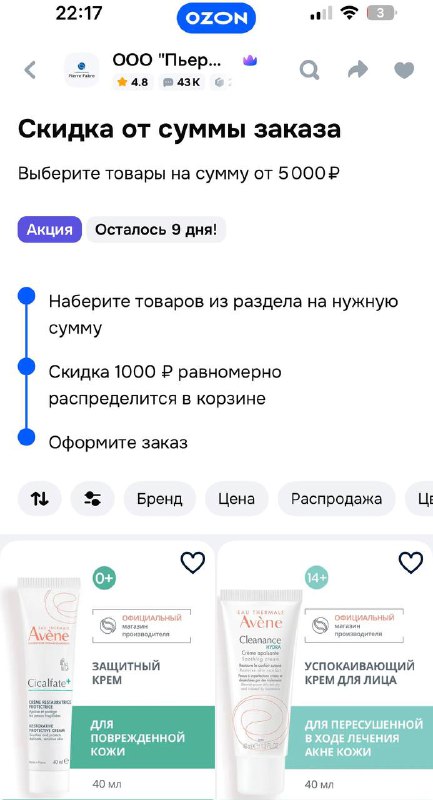 Скидка 1000 р при заказе от 5000 на Ozon на Avene https://ozon.ru/t/wGsBc5A Присылайте хорошие предложения по косметике, будем делиться. Уж очень дорого стало покупать косметику( давайте охотиться