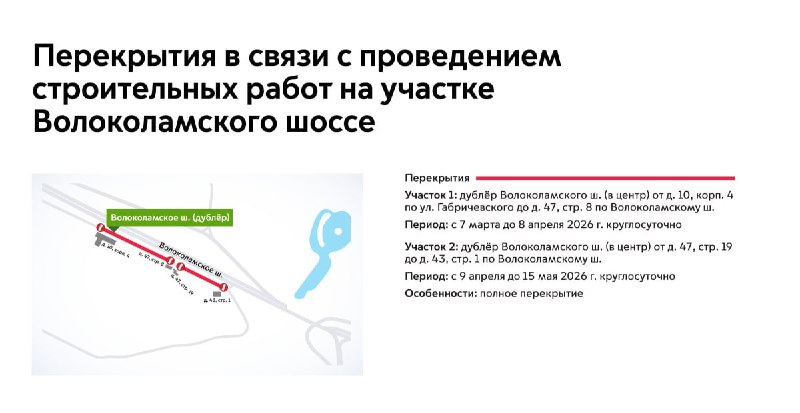 ❗️с 7 марта до 15 мая будут полностью закрыты для проезда участки дублёра Волоколамского шоссе. 🛠Это связано с проведением строительных работ. ❗️Водителям рекомендуют заранее планировать маршрут с