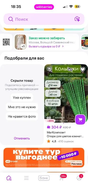 ВБ обновил интерфейс главной страницы мобильной версии приложения Теперь можно скрыть товары с главной страницы, выбрав пункт из предложенных «уже куплен» / «мне эти не нужно» / «не нравится фото».