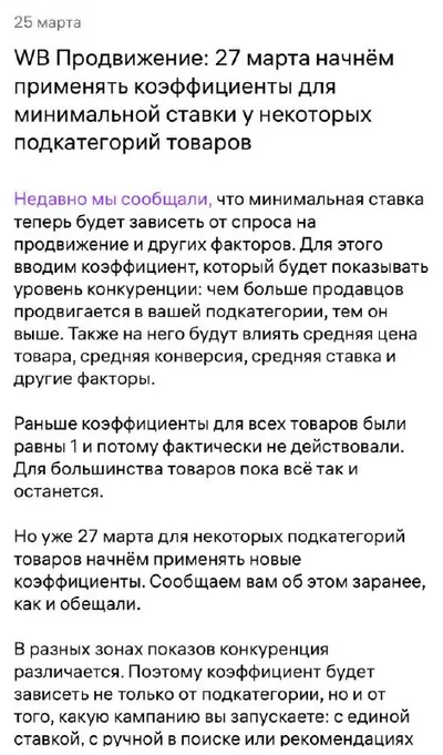 📢 Изменения минимальной ставки ВБ заботливо предупредил, что уже с 27 марта вводят новые коэффициенты. Напомним, от чего он будет зависеть: - от того, какую рекламу вы запускаете (единая, ручная по