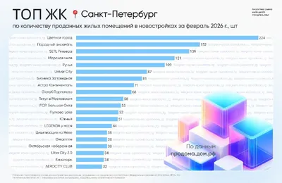 Представляем рейтинг жилых комплексов Санкт-Петербурга по количеству проданных квартир в новостройках за февраль 2026 г. ТОП возглавляют: 1️⃣ Цветной город — 224 шт. 2️⃣ Парадный ансамбль — 152 шт. 3