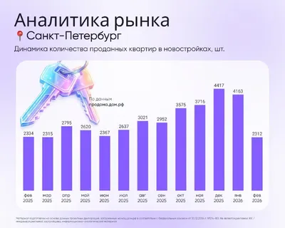 Публикуем динамику количества проданных квартир в новостройках Санкт-Петербурга с февраля 2025 по февраль 2026 г. В феврале 2026 года количество проданных квартир упало на 80% относительно показателе