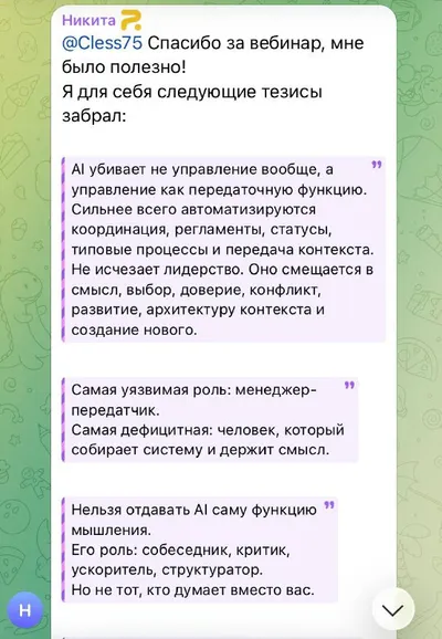 Когда участник думает вместе с тобой, вебинар получился 🎯. Вчера получил сообщение от участника вебинара “Компания без менеджеров — бред или следующая реальность?” Это Никита Аленчиков (@Noalench).