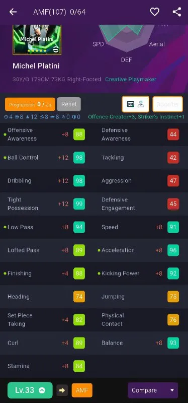 [Официальные статы] ✅ M. Platini со стилем Креативный плеймейкер • Уровни: 33 • Бустер: Offence Crator +3 ✅ • Особые навыки: Momentum Dribbling, Phenomenal Finishing, ⬆️ - открываем ⬇️ - скип @pro