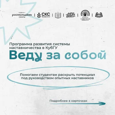 😍 Хочешь быть тем, к кому приходят за советом? Профком обучающихся КубГУ запускает проект «Веду за собой». Это программа наставничества для студентов, которые готовы помогать первокурсникам адаптиро
