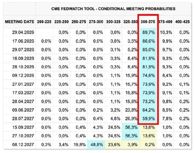 Ожидают, что ФРС не снизит процентную ставку в этом году. Ближайшее смягчение ожидается в сентябре 2027 года, но все может измениться с приходом Кевина Уорша в мае.