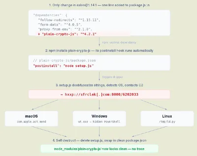 Вжух, и снова новость про безопасность: скомпрометирован NPM-пакет axios, имеющий 100 млн загрузок в неделю 🤯 Хакеры смогли перехватить учётку сопровождающего и выпустить два вредоносных выпуска NP