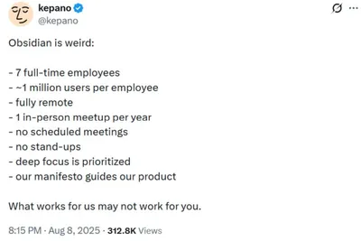 Obsidian на деле доказывает, каких результатов можно добиться без бесконечных звонков и митингов: маленькая команда, полная удалёнка, приоритет глубокой сосредоточенности и чёткое следование манифесту