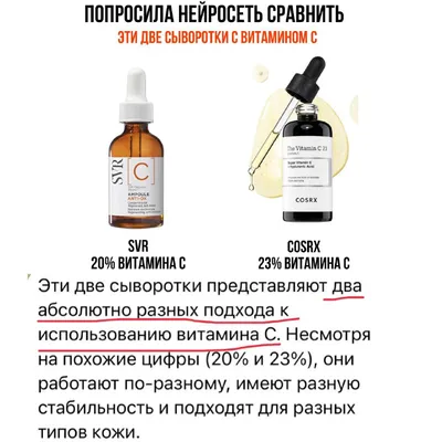 ☝️До этой сыворотки от Cosrx я несколько лет покупала SVR 20 % витамина С. В этом и этом постах про неё рассказывала. И черт меня дёрнул спросить чат GPT, чтобы он сравнил эти две сыворотки по сост