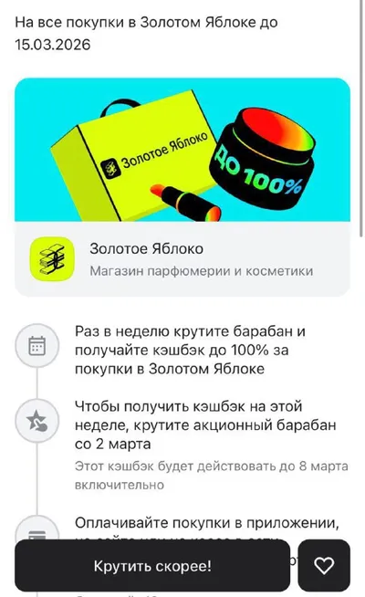 Сводка новостей по Золотому Яблоку! • На этой неделе продолжает действовать акция - суперкешбэк от Альфа банка. Снова крутим барабан. • Получаем 50 бонусов за мини-тесты в тг-боте Золотого Яблока. О