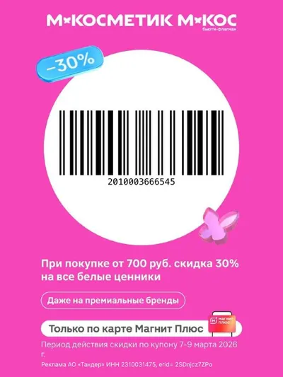 Сохраняйте новый купон на скидку в Магнит Косметик - 30 % от 700₽ на все белые ценники в чеке. Важные детали: • акция длится с 7 по 9 марта. • купон можно использовать сколько угодно раз в эти дни