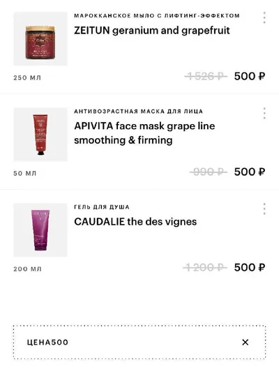 В Золотом Яблоке появился новый раздел ‘Бьюти за 500’: добавляете что-то из списка, в корзине применяете промокод ЦЕНА500 и всё становится по одной цене. Собираюсь забрать: •гель для душа Caudalie •м