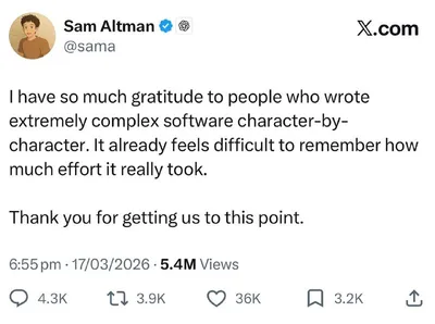 Сэм Альтман троллит программистов в своем твиттере: «Я безмерно благодарен людям, которые писали невероятно сложный софт — символ за символом. Уже сейчас трудно вспомнить, сколько усилий это на самом