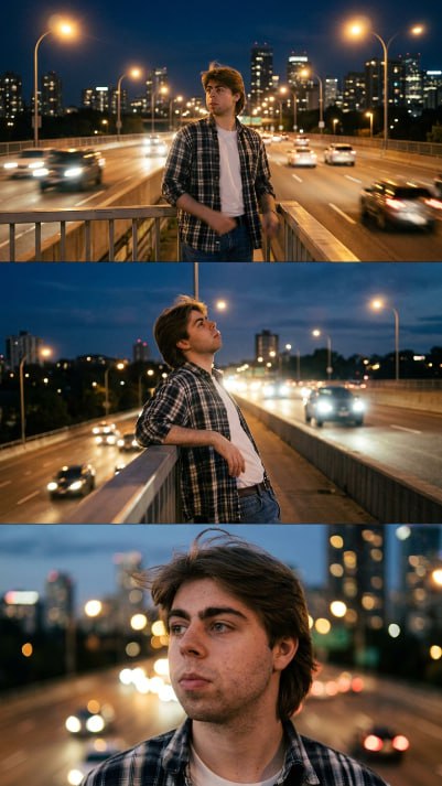 🖼️ Эстетичная фотосессия Генерируем очень эстетичную фотосессию в ночном городе: use the uploaded photo as the exact identity reference. keep the same person, same face, same facial features, same