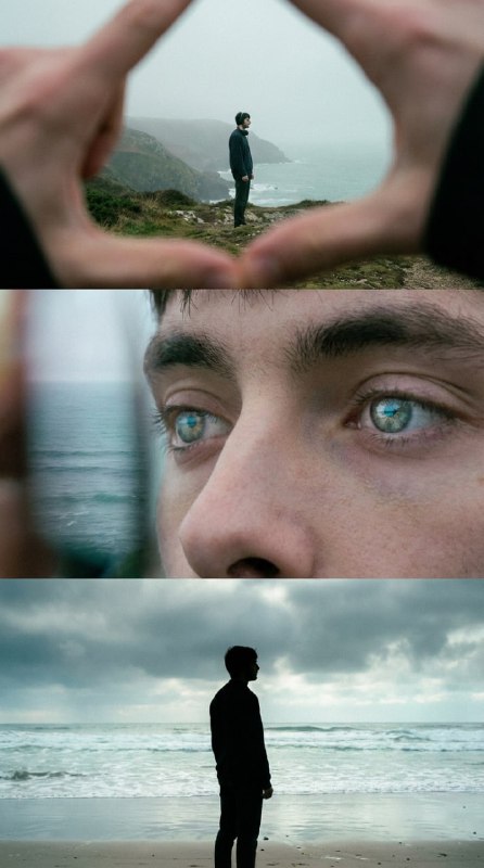 🖼️ Кинематографичный триптих Генерируем очень загадочное фото с вашей внешностью по этому промпту: Cinematic triptych with melancholic undertones, person from photo in distance framed by hands, mac