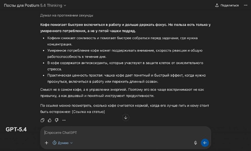 ⚔ И снова VERSUS. Сравнил, как пишут GPT-5.4 и GPT-5.3 с точки зрения естественности языка. И снова - пост о пользе кофе. Скрины текстов приложил выше. Текст от GPT-5.3 я разбирал вчера, повторяться