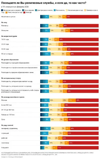 #тенденции 55% россиян сказали, что никогда не посещают религиозные службы. В XXI веке это рекордно высокая доля – с 22 по 25 год «никогда» на вопрос о частоте посещения религиозных служб отвечали 43
