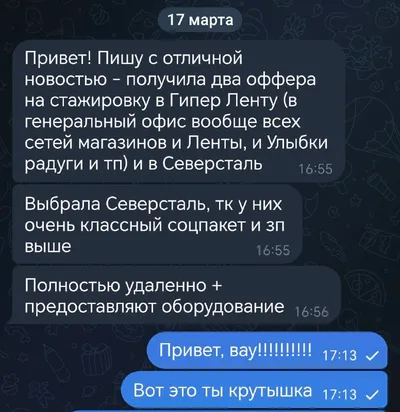 ДВА ОФФЕРА НА ТРЕТЬЕМ КУРСЕ УНИВЕРА 😳 Написала сегодня ученица моего курса по поиску работы, сразу после январской сессии она стала искать стажировки, и уже через месяц получила два оффера в крупные