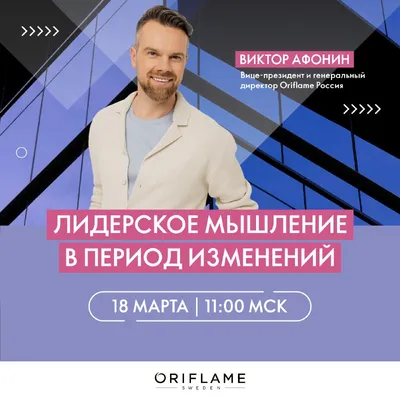 Приглашаем вас сегодня → 18 марта в 11:00 по московскому времени на эфир «Лидерское мышление в период изменений». ✅Вице-президент и генеральный директор Oriflame Россия Виктор Афонин, расскажет о: •