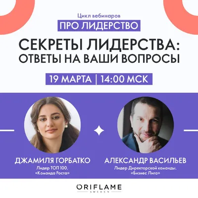 Приглашаем вас сегодня → 19 марта в 14:00 по московскому времени на вебинар «Секреты лидерства: ответы на ваши вопросы». ✅На этой встрече ТОП Партнёр Джамиля Горбатко и Бизнес Партнёр Александр Васил