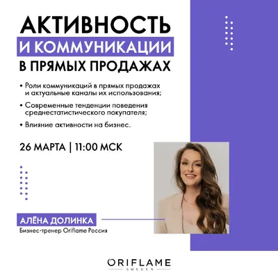 Приглашаем вас сегодня → 26 марта в 11:00 по московскому времени на вебинар «Активность и коммуникации в прямых продажах». ✅Бизнес-тренер Oriflame Россия Алёна Долинка расскажет о: • Роли коммуникац