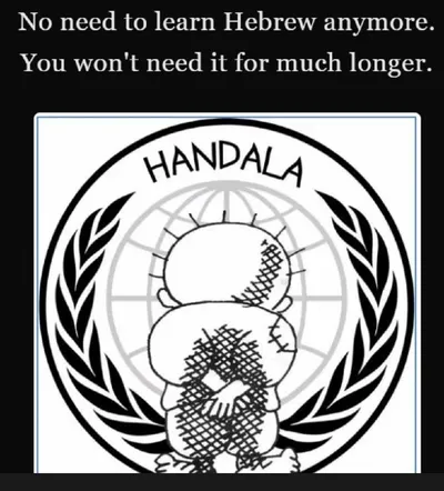 Иранские хакеры покусились на святое – взломали сайт академии языка иврит. Они повесили картинку Хандалы и написали что на английском, что учить иврит больше не нужно. Хандала --это такой палестинск