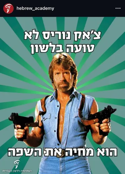 Академия языка иврит на смерть Чака Нориса: На картинке: Чак Норис не совершает языковых ошибок, он вводит неологизмы(возрождает язык) Дальше перевод того, что можно адекватно перевести на русский